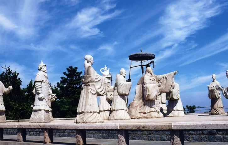 在瑯琊臺頂,共有石雕像14尊:秦始皇、徐福、胡亥、李斯、趙高和文武官員、武士、侍女、侍從等。群雕生動地表現(xiàn)了公元前210年秦始皇第三次巡游瑯琊時,徐福向秦始皇講述海上求仙經(jīng)過的場面。版權(quán)所有山東聊城聊之旅國際旅行社有限公司,轉(zhuǎn)載必究!作品的整體氣韻與古臺、高天、大海和群山的背景渾然融合而又相互襯托,氣勢宏大。群雕把一個充滿傳奇色彩的歷史場面燦然凝固在瑯琊臺上。