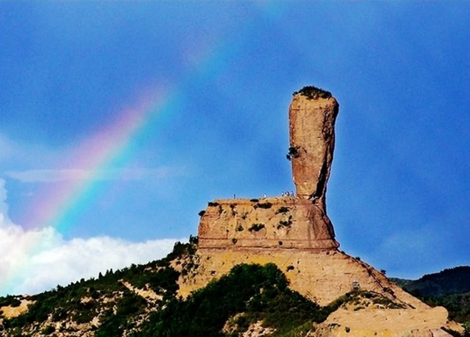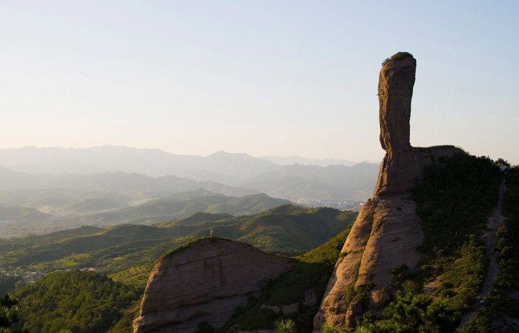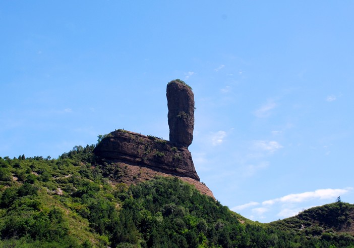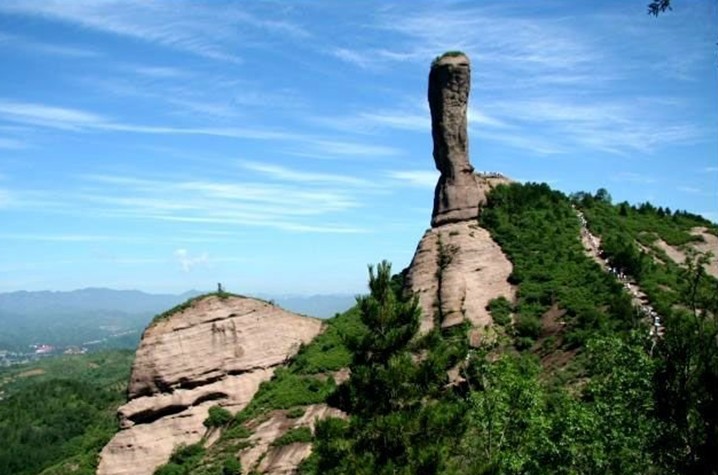 磬錘峰,古稱石挺,俗稱棒槌山。早在1400多年前,北魏著名地理學(xué)家酈道元在《水經(jīng)注》中就有記載,稱其“孤石云舉,臨崖危峻,可高百余仞”。經(jīng)實(shí)際測(cè)量,磬錘峰海拔596.29米,槌高38.29米,連同基座高59.42米,上部直徑15.04米,下部直徑10.7米,體積約為6508立方米,重約16205噸,估計(jì)已有300萬年的高齡。峰槌半山腰有一株桑樹,高約3米,大約有300多年的樹齡。
