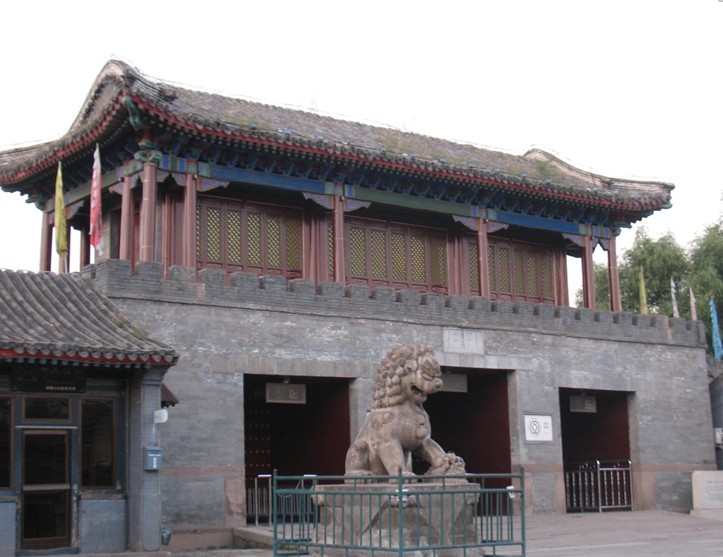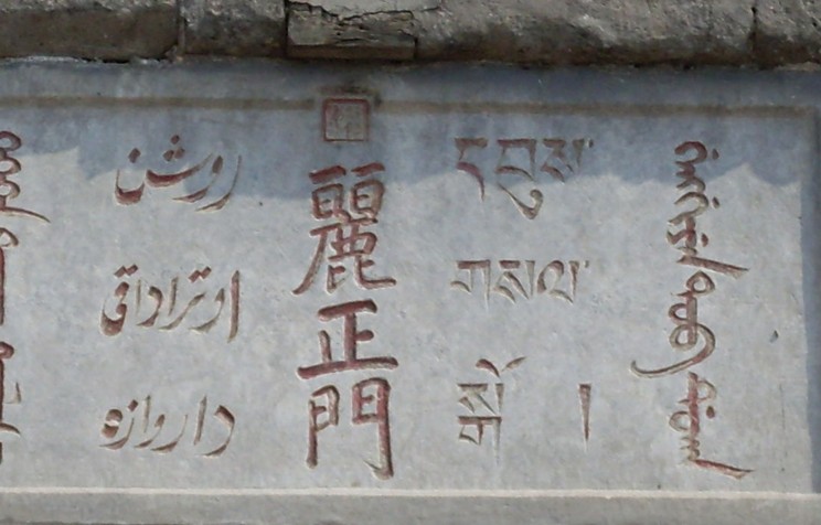 門前列石獅和下馬碑,迎面有紅照壁,門上有閣樓,下有3門,高敞宏偉。中門上方有乾隆題額“麗正門”三字,取《易經》“日月麗乎于天”之意,用漢、滿、蒙、藏、維五種文字刻成。它和門內上方乾隆題詩“兩字新題標麗正,車書恒此會遐方”,象征著國內各民族團結,國家強盛、統(tǒng)一。