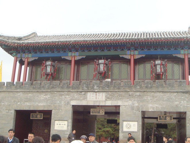 麗正門既是避暑山莊的正門,也是正宮的正門,建于乾隆十九年(1754年)。它是個重臺城門,有三個長方形拱門入口,重臺上建有城閣三間。門前列石獅一對,左右立下馬碑各一,迎面建有30米長的紅照壁。布局規(guī)格嚴整,風格質樸秀麗,為避暑山莊的乾隆三十六景之首。
