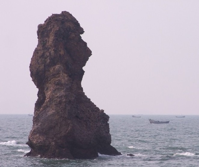 在午山腳下臨海斷崖南側(cè),距岸百米處有一座17米高的石柱,形如老人坐在碧波之中