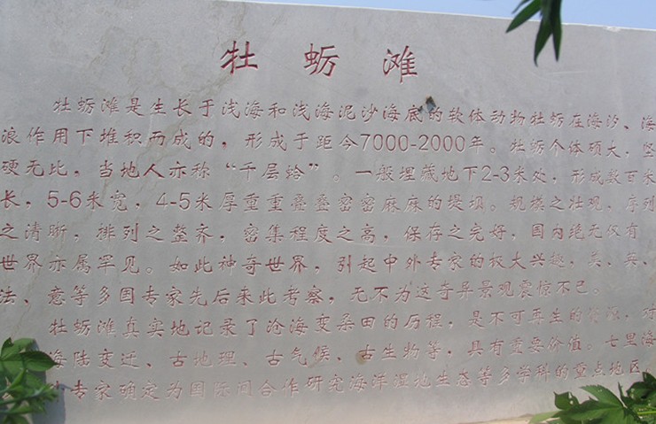 蠣灘形成于距今7000-2000年,是世界上迄今發(fā)現的規(guī)模最大、分布最廣、序列最清晰的古海岸遺跡。分布在寶坻縣南部和寧河縣中部、東部地區(qū)。它是由牡蠣殼堆積而成的,從中可以反映出古海灣的變遷。天津的牡蠣灘,無論從面積上,還是從厚度上,都是世所罕見的,如寧河縣西部東棘坨鄉(xiāng)史莊子到姜莊子間的河道,以及寧河縣東部靠近京山鐵路的裴莊,這兩地牡蠣灘的規(guī)模、剖面層厚度、清晰度、殼體長度世所罕見,對海洋生態(tài)及海陸變遷等學科的研究具有寶貴的價值。