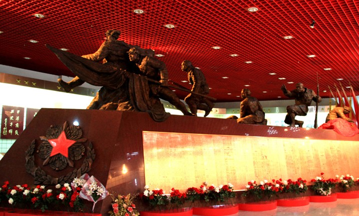 大廳正中央的鑄銅雕像《走向勝利》,表現(xiàn)了中共中央毛澤東和劉少奇、朱德、周恩來、任弼時五位書記的領(lǐng)袖風(fēng)采;墻屏上毛澤東主席關(guān)于平津戰(zhàn)役作戰(zhàn)方針的浮雕手跡熠熠生輝;環(huán)周巨幅壁畫《勝利交響詩》反映了東北、華北兩大區(qū)軍民英勇奮戰(zhàn)、奪取戰(zhàn)役勝利的宏大場面。
