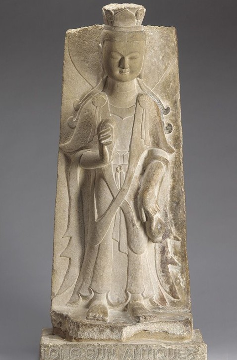 石像高3.9米,腰圍2米,手長40厘米,背北面南,立于50厘米高的石雕蓮花座上。石像刻線明顯,披巾搭胸,細(xì)腰束帶。雕線棱角分明,刀法洗煉,在個(gè)體石像中甚為罕見,為我國古代石雕珍品?,F(xiàn)為省級(jí)重點(diǎn)文物保護(hù)單位。