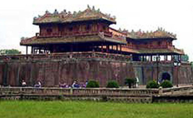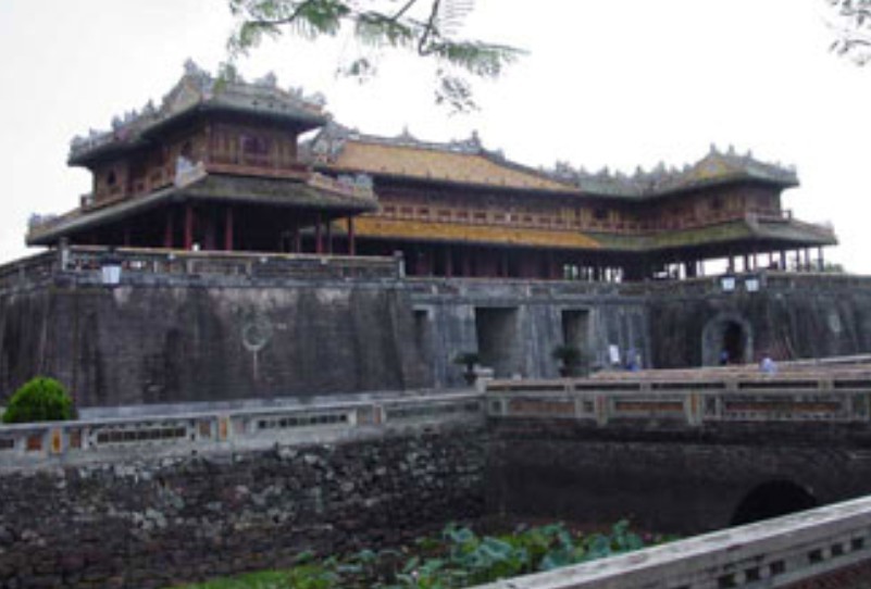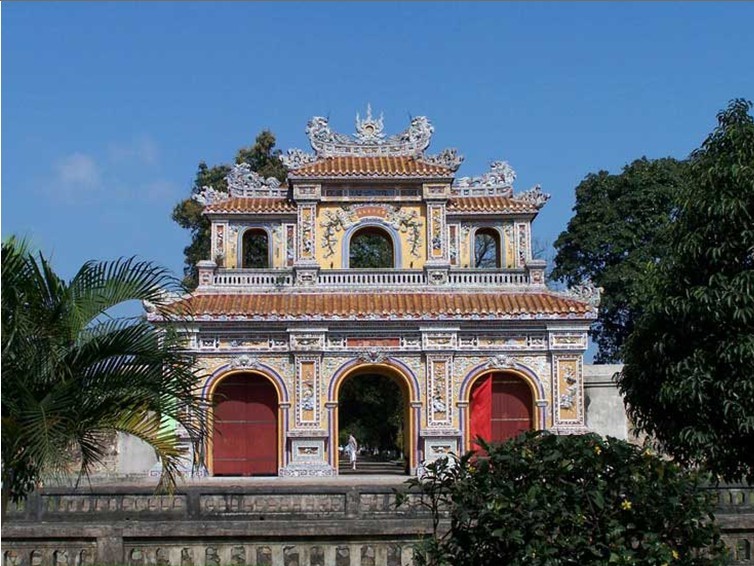 越南順化故宮正門。規(guī)模比中國北京故宮的午門小,但其式樣基本一樣。平面呈冂形,下有高大的磚石墩臺,臺正面圍以垛墻。墩臺有5門,正中門高5.32米,寬3.28米,門正中上方有“午門”兩個大字。當初字外包金,1943年12月10日包金被竊。墩臺上建樓5座,名五鳳樓,樓分兩層,氣勢巍峨。下層正中是“御座”。上層為各宮人觀禮之所。當時,午門只在慶典節(jié)日開放。午門也是阮氏王朝被埋葬的見證,1945年8月30日阮朝末代皇帝被迫在此正式宣布遜位,并把金印和寶劍交給越南臨時政府代表團。午門建于阮朝明命十四年(公元1833年),啟定三年(1921年)重修??箲?zhàn)期間遭炮火破壞,現(xiàn)已修復。以前,阮朝嘉隆初年曾在午門現(xiàn)址建有南闕臺。