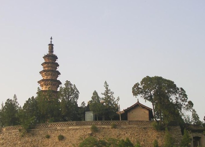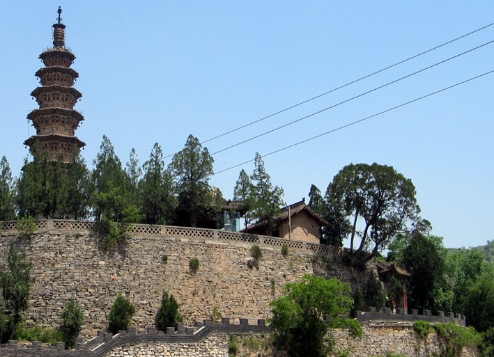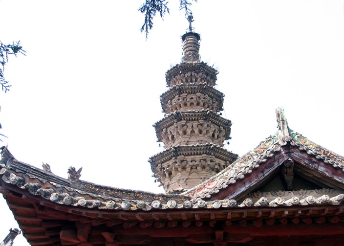 殿西矗立著北宋元祐二年(公元1087年)建造的大圣寶塔(俗稱青龍寶塔) 巍峨凌云。塔身八角七級,高17米,層層飛檐斗拱,節(jié)節(jié)精雕細刻,形狀各異。塔頂八角安裝8個鐵人,個個威風凜凜,閃閃發(fā)光。每個塔角各掛一個鐵鈴,風映鈴響,叮鈴不止。