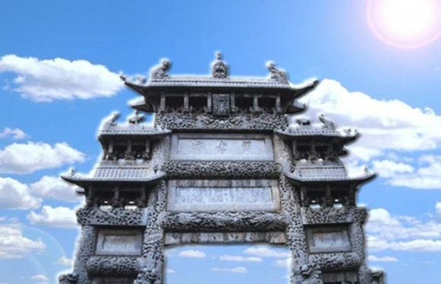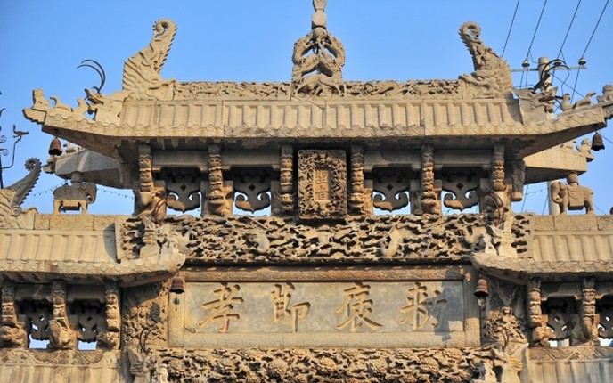 因雕有一百個(gè)不同書體的壽字而得名。坊以青色魚子狀石灰?guī)r構(gòu)成,通高l3米、寬8米,四柱三間三層樓閣式建筑。其獨(dú)特之處是:坊座雕有8頭矯健雄獅昂首遠(yuǎn)望,8條出水蚊龍繞柱回舞,額枋上飾滿盛開牡丹,與正間上下額枋祥云間翩翩飛舞的5只透雕仙鶴、次間上額枋浮雕的相對(duì)翱翔之鸞鳳構(gòu)成了具有無窮魅力之藝術(shù)佳作,寓意福壽萬年、富貴無媲或喜上眉梢。