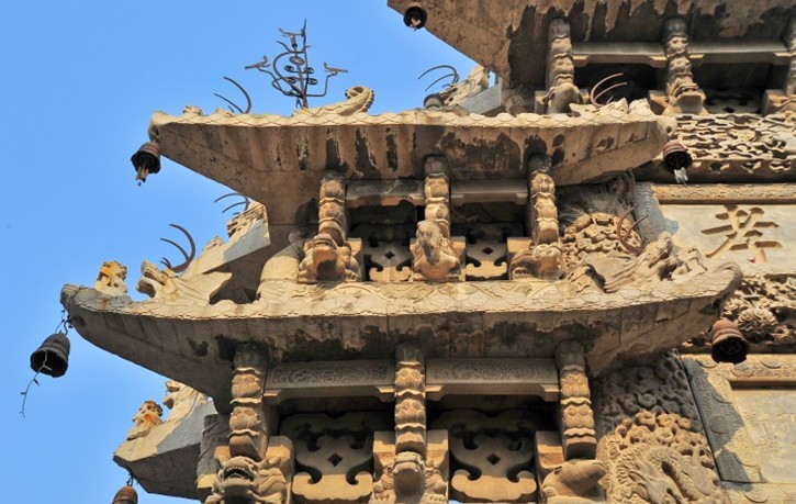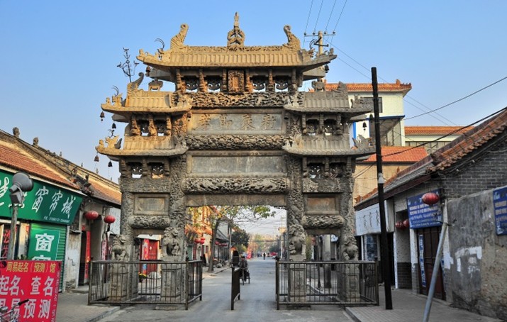 百壽坊俗稱朱家牌坊,位于單縣城內(nèi)勝利北街,乃清乾隆三十年(1765年)為翰林院孔目贈(zèng)儒林郎朱叔琪妻孔氏而建,因雕有一百個(gè)不同書體的壽字而得名。坊以青色魚子狀石灰?guī)r構(gòu)成,通高l3米、寬8米,四柱三間三層樓閣式建筑。其獨(dú)特之處是:坊座雕有8頭矯健雄獅昂首遠(yuǎn)望,8條出水蚊龍繞柱回舞,額枋上飾滿盛開牡丹,與正間上下額枋祥云間翩翩飛舞的5只透雕仙鶴、次間上額枋浮雕的相對(duì)翱翔之鸞鳳構(gòu)成了具有無窮魅力之藝術(shù)佳作,寓意福壽萬年、富貴無媲或喜上眉梢。