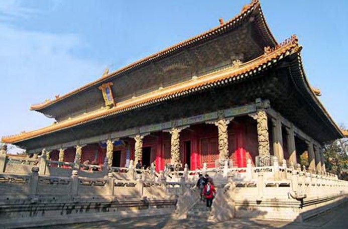 大成殿是孔廟的正殿,也是孔廟的核心。唐代時稱文宣王殿,共有五間。宋天禧五年(公元 102年)大修時,移今址并擴(kuò)為七間。宋崇寧三年(公元1104年)徽宗趙佶取《孟子》:“孔子之謂集大成”語義,下詔更名為“大成殿”,清雍正二年(公元 1724年)重建,九脊重檐,黃瓦覆頂,雕梁畫棟,八斗藻井飾以金龍和璽彩圖,雙重飛檐正中豎匾上刻清雍正皇帝御書“大成殿”三個貼金大字。殿高 24.8米,長45.69米,寬24.85米,坐落在2.1米高的殿基上,為全廟最高建筑,也是中國三大古殿之一。