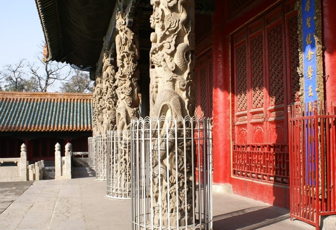 大成殿為孔廟之主殿,唐代稱“文宣王殿”。“大成”乃因宋徽宗趙倩尊孔子為“集古圣先賢之大成”而改名為“大成殿”,并御書匾額。大成殿不僅殿宇宏大,裝飾華麗,為全國孔廟之冠,而且此殿前檐十根雕龍石柱,龍姿飛揚(yáng),為宮殿建筑中前所未見,連紫禁城的龍柱也相形見細(xì)。據(jù)傳每當(dāng)皇帝前來祭孔時,要將龍柱用紅縷包裹起來,以免皇帝發(fā)現(xiàn),犯殺頭之罪。殿內(nèi)正中奉把孔子塑像,兩旁為四配和十二哲的塑像。殿前東西民廊原供孔門弟子及儒家歷代先賢,現(xiàn)已辟為陳列室,陳列著歷代碑刻,為書法、繪畫、雕刻的藝術(shù)寶庫。寢殿后的圣跡殿,藏有明代石刻連環(huán)畫120幅,記述了孔于的業(yè)跡。故宅井后的魯壁為秦始皇焚書坑儒時,孔子第九代孫孔鮑收藏《尚書》、《禮記》、《論語》、《孝經(jīng)》等的夾墻,人們?yōu)榱思o(jì)念孔鮑保護(hù)古代文化的功績,特地修建了這個魯壁。