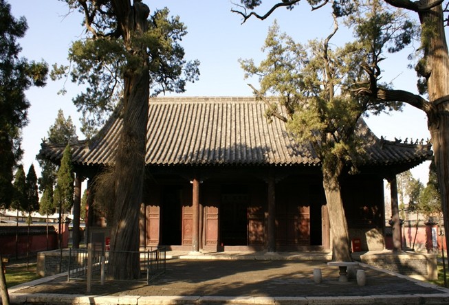 在孟廟寢殿前露臺和甬道之上,有3株古檜。據(jù)《三遷志》記載,為北宋宣和年間所植,距今已有近900年的歷史,是孟廟內(nèi)最為古老的樹木之一,現(xiàn)依然青翠蓊郁,茁壯茂盛。奇妙的是其中一株古檜,不僅樹頂干枝造型為“鹿回頭”(林默涵語),頗為奇特,而且在樹干之上的鳥洞中寄生出數(shù)株枸杞,枝繁葉茂。夏秋之際,碧綠的枸杞葉簇?fù)碇t紅的果實,迎風(fēng)搖曳,妙趣橫生,煞是喜人。