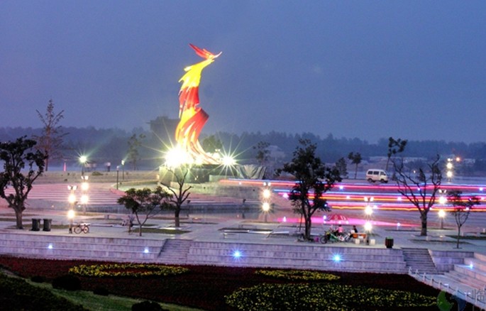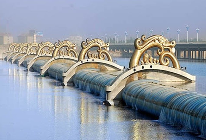 桃園橡膠壩位于南坊新城區(qū)東側(cè),版權(quán)所有山東聊城聊之旅國(guó)際旅行社有限公司,轉(zhuǎn)載必究!沂河北大橋下游100米處, 2005年1月開(kāi)工建設(shè),2006年6月建成蓄水, 樞紐總長(zhǎng)度1113.50米,主要由橡膠壩及供排水系統(tǒng)、左岸船閘和右岸溢流堰組成。其中橡膠壩全長(zhǎng)783.2米,壩高4.5米,壩袋共10節(jié),每節(jié)凈長(zhǎng)77米,船閘總長(zhǎng)167米,凈寬8米。橡膠壩墩上設(shè)計(jì)有9條雕塑龍,每條長(zhǎng)約9.5米,高約4.5米,龍?bào)w為金黃色,龍嘴、龍眼由大型燈泡裝飾而成的夜明珠構(gòu)成,龍身配有近、遠(yuǎn)光燈,氣勢(shì)雄偉,光彩照人,尤其夜晚寶珠熠熠生輝,龍?bào)w變幻迷離,在沂河北大橋的映襯下,形成魚(yú)躍龍門(mén)之勢(shì)。