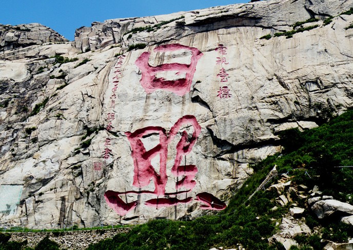 河山山勢(shì)崢嶸,氣勢(shì)雄偉,遍布古跡,處處勝景,使游人大有登泰山之感。代表日照現(xiàn)代形象的巨書“日照”兩字刻于河山懸壁之上。“日”字長(zhǎng)20米,寬17.5米:“照”字長(zhǎng)25米,寬 25.5米。它是漢字摩崖石刻的世界之最,載入世界吉尼斯大全,給河山增添了一大景觀。