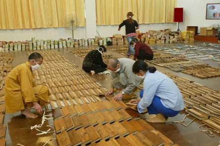這里還存有用血書(shū)寫(xiě)的經(jīng)書(shū)557冊(cè)。這是涌泉寺“三寶”之一。這些血經(jīng)系清光緒年間,華能和尚刺臂血,由信士王谷楷書(shū)“大乘般若波羅密真經(jīng)”全部,定慧大師刺血、克定書(shū)寫(xiě)“佛說(shuō)四十二章經(jīng)”等。用鮮血寫(xiě)成幾百冊(cè)佛經(jīng),需要很長(zhǎng)的時(shí)間和大量的鮮血,這就需要刺血的人長(zhǎng)期不吃鹽,血在書(shū)寫(xiě)時(shí)才不會(huì)很快凝固。這些佛經(jīng)中,一部分字呈鮮紅色,是因?yàn)樵谘姓{(diào)了朱砂;一部分暗紅色,則是不調(diào)朱砂的。血書(shū)數(shù)百冊(cè)佛經(jīng),表達(dá)了血書(shū)人十分的虔誠(chéng)和不凡的毅力。