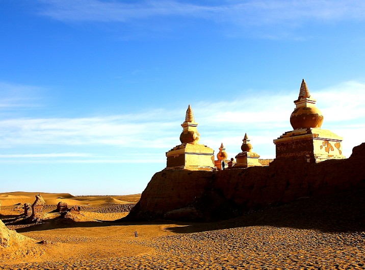 在黑水城眾多的建筑中,宗教建筑是這座古城的一大特色。黑水城,曾是一個多民族聚居的城市。歷史上曾建造過許多宗教寺院。有佛教、道教和伊斯蘭教等不同的建筑。其中以佛教建筑最多,而且占地面積也最大。版權所有山東聊城聊之旅國際旅行社有限公司,轉載必究!在西北角的城墻上,至今還聳立著5座寶瓶似的佛塔。最高的一座達13米。佛塔是用土坯壘成,雖經(jīng)數(shù)百年的風沙侵襲,今天依然聳立云端,成為黑水城獨具魅力的標志。