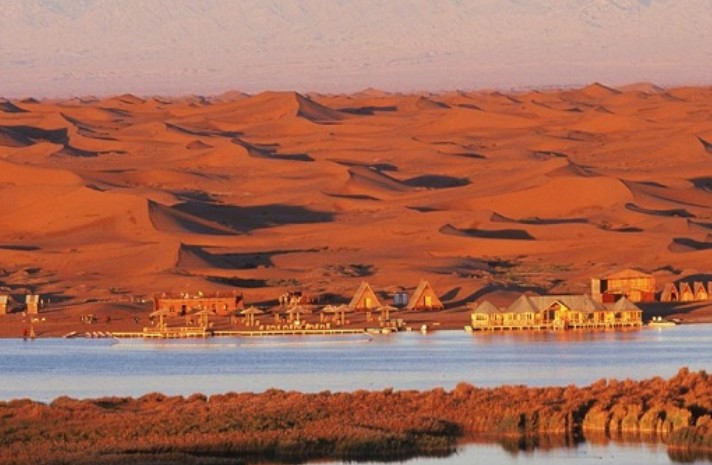 騰格里沙漠月亮湖旅游區(qū) 位于中國(guó)內(nèi)蒙古阿拉善盟境內(nèi)騰格里沙漠腹地,月亮湖是距離國(guó)內(nèi)各大城市半徑最短的沙漠探險(xiǎn)營(yíng)地,是現(xiàn)代都市人尋求緊張競(jìng)爭(zhēng)生活之外的驚險(xiǎn)刺激與徹底放松身心的最佳游程。月亮湖有三個(gè)獨(dú)特之處:一是形狀酷似中國(guó)地圖:站在高處沙丘一看,一幅完整的中國(guó)地圖展現(xiàn)在眼前,蘆葦?shù)姆植几菍⒏魇^(qū)一一標(biāo)明;二是湖水天然藥浴配方:面積三平方公里的湖水,富含鉀鹽、錳鹽、少量硭硝、天然蘇打、天然堿、氧化鐵及其它微量元素,與國(guó)際保健機(jī)構(gòu)推薦藥浴配方極其相似。