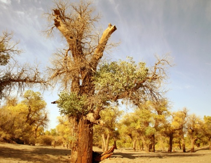 胡楊,又名胡桐,蒙古語叫“陶來”,是當今世界上最古老的楊樹品種,被譽為“活著的化石樹”。有“活著不死1000年,死后不倒1000年,倒地不爛1000年”之說。胡楊是一種極珍貴的喬木樹種,其珍貴性可與銀杏樹相比,額濟納旗(額濟納旗位于內(nèi)蒙古自治區(qū)阿拉善盟境內(nèi),內(nèi)蒙古自治區(qū)的西北端,與阿拉善盟署所在地巴彥浩特(阿左旗)相距近七百公里,距酒泉市396公里。)有世界上僅存的三大胡楊林區(qū)之一。對胡楊樹的這種盛譽,使得額濟納人無比自豪——“不到額濟那旗,不知道大漠綠洲的雄大氣派;不親臨胡楊林,也無從領(lǐng)略胡楊樹的神奇之美”。 額濟納旗胡楊很有名,也因胡楊吸引了很多人,張藝謀就在這里拍過電影“英雄”。金黃的秋色讓人驚心動魄。胡楊,是生活在沙漠中的惟一的喬木樹種,而且,它自始至終見證了中國西北干旱區(qū)走向荒漠化的過程。而今,雖然它已退縮至沙漠河岸地帶,但仍然被稱為“死亡之海”的沙漠的生命之魂。額濟納旗是胡楊樹的故鄉(xiāng),世界上僅有的三大胡楊林之一,胡楊樹的神奇之處在于一棵樹上可長出三種葉狀———楓葉、楊葉和柳葉,所以胡楊又叫“三葉樹”。欣賞胡楊的過程,就是感悟生命的過程。所謂死后千年不倒,倒下千年不腐,那究竟是怎樣的一種意境!