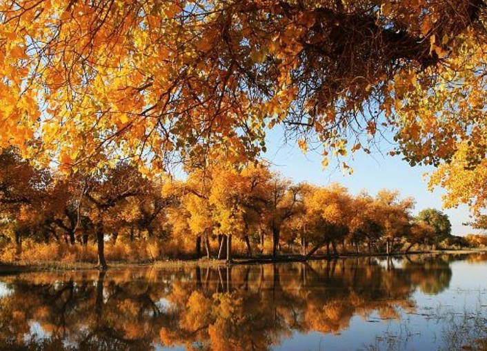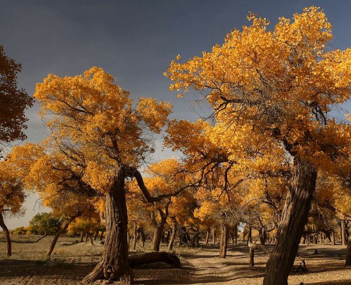 內(nèi)蒙古阿拉善盟的額濟納旗,現(xiàn)有天然胡楊林45萬畝,是世界僅存的三大胡楊林之一,是國家自然保護區(qū)和國家森林公園。胡楊林是一個古老的樹種,被譽為“植物活化石”,有“生一千年不死,死一千年不倒,倒一千年不朽”的美譽。胡楊,又名“梧桐”,為古地中海殘遺物種,屬落葉喬木,蒙古語稱為“陶來”。胡楊木質(zhì)纖細柔軟,樹葉闊大清香,耐旱,生命力頑強,是自然界稀有的樹種之一。金秋十月,額濟納是一個童話般的世界。胡楊金葉掛滿枝頭,細細看來,在樹枝間竟尋不到一片異色葉子,密密匝匝,金光燦爛,至純至美;遠遠望去,一片片金色的胡楊把大漠裝點得如詩如畫,匯集成金色的海洋,吸引著大批國內(nèi)外賓客到此旅游、采風、攝影。