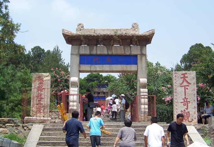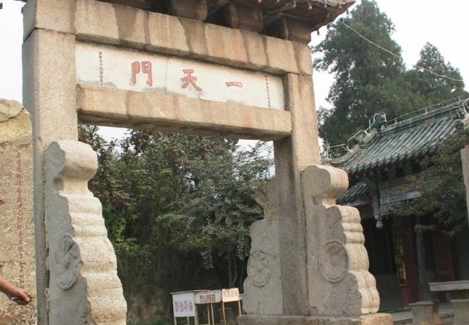 宮前三重石坊形若階梯。前為一天門坊,明代建,參政龍光題額,清康熙五十六年(1717年)巡撫李樹(shù)德重建,兩側(cè)有明代人題“天下奇觀”及“盤路起工處”大字碑。中有孔子登臨處坊,明嘉靖三十九年(1560年)巡撫山東都察院右副都御史朱衡等建,嘉靖狀元羅洪先題額并聯(lián):“秦王獨(dú)步傳千古,圣主遙臨慶萬(wàn)年。”聯(lián)語(yǔ)于1967年被鑿毀。
