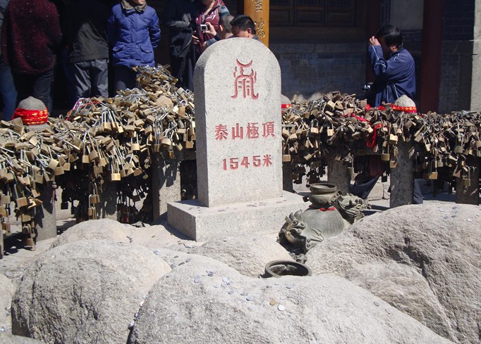 四周圍以石欄,是泰山的最高點,石上有南陽王均于1921年題寫的“極頂”二字。西北側(cè)有“古登封臺”碑,古代帝王登山祭天,就在此處設(shè)置祭壇。玉皇頂傲視群雄,亭立峰巔,極目四望,確有“一覽眾山小”之感。