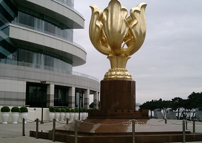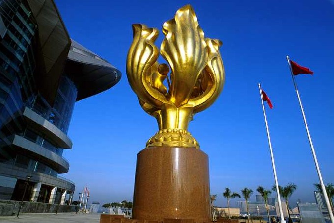 香港特別行政區(qū)成立后,中央政府把一座金紫荊雕塑送贈香港,并安放在金紫荊廣場上,這朵紫荊花乃鍍金雕像,外表金光閃閃,于日光下發(fā)出耀眼金光。而且國旗及區(qū)旗每日早上八時于此處升起,并奏放國歌,吸引了大量游客至此觀看升旗禮。