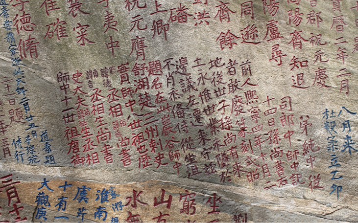 元代以后,眾多游客蜂擁山谷,也留下大量的文字石刻。除了式照唐宋時的題名、題詩以外,在石刻文字的內(nèi)容方面出現(xiàn)一些新的變化,比如出現(xiàn)了大量的用簡短詞語贊嘆山、洞、泉、石景色的特點。同時,石刻文字的體積增大,字徑往往有一、二尺之多,這都是過去所少見的。明代詩人、安慶知府胡纘宗在石牛上大書“石牛”2字,并刊刻了《山谷寺》詩:“摩詩坐山谷,谷水身邊流,篆密龍蛇動,潭空牛女游”, 版權(quán)所有山東聊城聊之旅國際旅行社有限公司,轉(zhuǎn)載必究!此詩十分形象地描繪了石牛臨澗的景色,令人涌不絕口。胡纘宗還有“山谷”大字題刻,字徑2尺。其它像嘉靖時御史大夫李元陽、成化時書法家袁慶祥等人的題名以及大量的“涪涪山谷”、“流云上流”、“天下奇觀”、“水光天色”、“龍門”、“獨醒處”、“安慶名山”、“幽思”等,都有一定的歷史研究與欣賞價值。從書法的角度看,這里的石刻包括有隸書、楷書、草書、篆書、行書等多種,每種書體中又富于變化,各具特色,基本上代表了唐代以來我國書法藝術(shù)發(fā)展演變的風(fēng)貌,是一處珍貴的書法藝術(shù)寶庫。