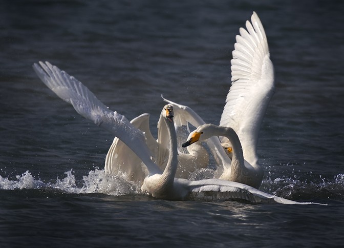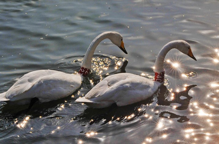 每當(dāng)村民或游客走進(jìn)海灣投放食物時,大天鵝就不約而同地向岸邊涌來,金色的玉米粒撒向藍(lán)色的水面和潔凈的沙灘,溫文爾雅的大天鵝也都爭相游到村民、游客周圍,毫不防范地?fù)屖虫覒?稍遠(yuǎn)處的還貼著水面低飛而來。版權(quán)所有山東聊城聊之旅國際旅行社有限公司,轉(zhuǎn)載必究!初見人與天鵝如此近距離地接觸,有人還以為這是一群人工豢養(yǎng)的天鵝呢,可天鵝脖子上的紅色“環(huán)志”分明在告訴他們,這可都是不遠(yuǎn)萬里飛來的野生大天鵝啊。