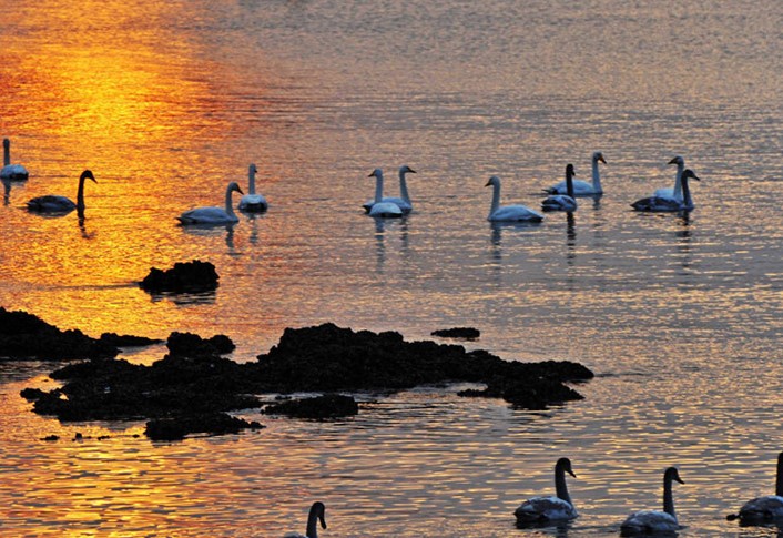 煙墩角天鵝湖是位于古煙墩遺址崮山島和中華海上第一奇石——花斑彩石之間的一個黃海海灣,面積不到一平方公里。海灣兩側(cè)各有一條淡水小溪流入,灣里水清浪柔,生長著豐富的魚蝦和浮游生物,這些為大天鵝棲息提供了適宜的自然環(huán)境。于是,每到寒風(fēng)飄雪時節(jié),成群結(jié)隊(duì)的大天鵝就來到這里,在碧波蕩漾的海灣里,或自在游弋,或追逐戲水,或引吭高歌,或凌空翱翔,或翩翩起舞,使人如臨仙境,如夢如幻。