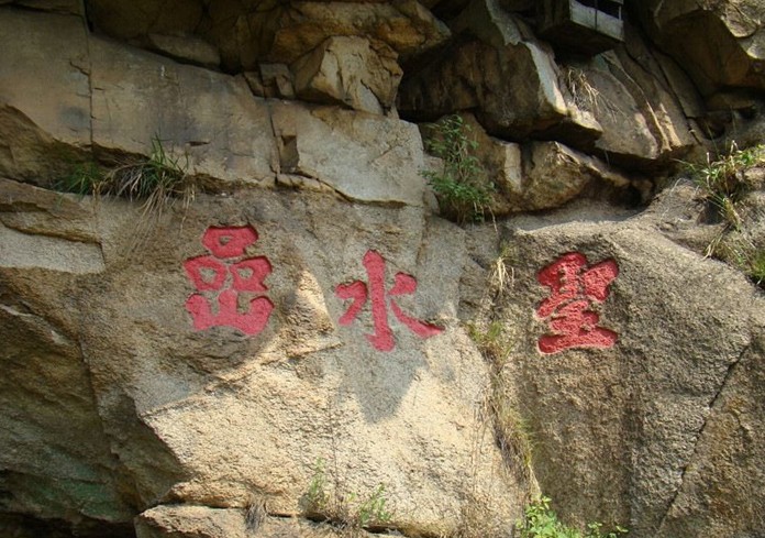 玉陽洞西側下方有一天然石洞〔俗稱“濕洞”〕,洞口像張開的巨大蛤蟆嘴。洞壁巖石交合處,東西各有一個石縫,圣水從石縫中流出。據(jù)《寧海州志》記載:“洞中東西二流,自石罅出,激激如線,二源一停一注,十二年一周,東西相更代,故曰‘圣水’。且天將雨,則漏天滴滴,濺人衣裙,版權所有山東聊城聊之旅國際旅行社有限公司,轉載必究!晴則否,山下人以此卜陰晴屢驗。”金朝散大夫 有文云“水不見發(fā)源,但嵌嵌之下,裂石而出,激激如線,味甘冷且清,春秋不變,水旱不知,蛙蠅之屬未嘗產(chǎn)焉,此亦異也。”欄版上題銘:“大安三年(1211年)二月日高 生說囗”。