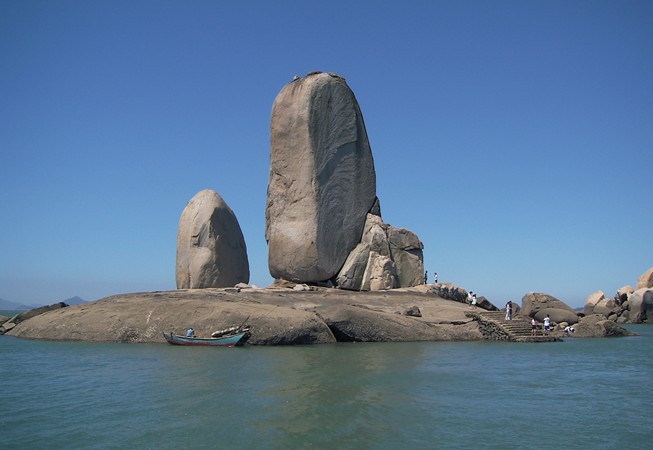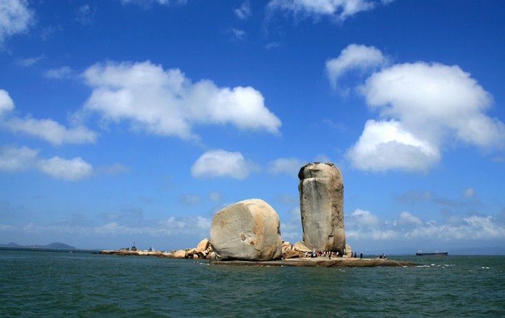 從看澳村岸邊坐渡船,十幾分鐘就到達(dá)礁石上,礁石底部是一組平坦完整的巖石。兩個(gè)石柱均由粗?;野咨幕◢弾r組成 東側(cè)的一個(gè)高達(dá)33米,胸寬9米,厚8米;西側(cè)的一個(gè)高17米,胸寬15米,厚8米。版權(quán)所有山東聊城聊之旅國(guó)際旅行社有限公司,轉(zhuǎn)載必究!兩個(gè)石柱的底部都是近似四方形體,直立在礁石上。據(jù)地質(zhì)學(xué)家考證是世界上最大的花崗巖球狀風(fēng)化海蝕柱。由于它的奇特壯觀,對(duì)游人有著強(qiáng)烈的震撼力和吸引力。建設(shè)部與中科院的專家稱之為:“壟斷性的世界級(jí)旅游資源。”明代旅行家陳第曾譽(yù)之為“天下奇觀”, 清朝女詩(shī)人林淑貞詩(shī)贊:“共說(shuō)前朝帝子舟,雙帆偶趁此句留;料因濁世風(fēng)波險(xiǎn),一泊于今纜不收.