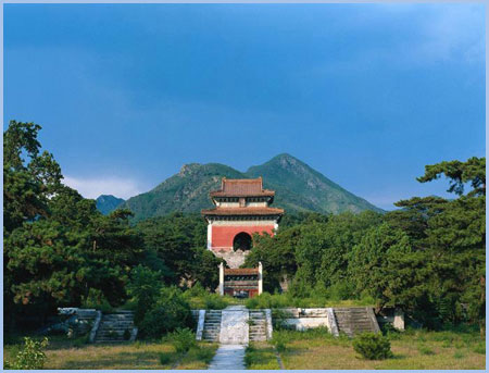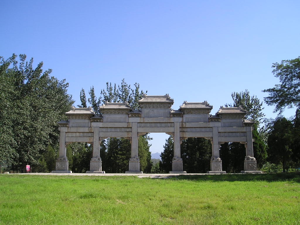 大紅門 坐落于陵區(qū)的正南面,門分三洞,又名大宮門,為陵園的正門。大門兩旁原各豎一通石碑,上刻"官員人等至此下馬"字樣。凡是前來祭陵的人,都必須從此步入陵園,以顯示皇陵的無上尊嚴(yán)。大門兩側(cè)原設(shè)有兩個角門,并連接著長達(dá)80華里的紅色圍墻。在蜿蜒連綿的圍墻中,另設(shè)有一座小紅門和十個出入口,均派有重兵駐守,是百姓不可接近的禁地。現(xiàn)在這些圍墻都早已坍塌,有些殘跡尚依稀可辨。