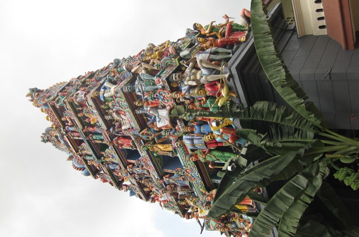 維拉瑪卡里雅曼興都廟(Sri Veeramakliaman Temple)建于1855年。特殊的彩繪門樓屬典型的南印度建筑風(fēng)格,門上高聳的塔樓上裝飾許多立體的彩色神像,廟里則是供奉主掌生死的"卡莉女神"(Kali)。雕刻在門樓上的印度教諸神與圣物牛、斗士等,在太陽(yáng)的照耀下閃閃發(fā)光,耀人眼目。寺廟周圍的墻壁,都被涂成紅白色,極富喜慶氣氛。
