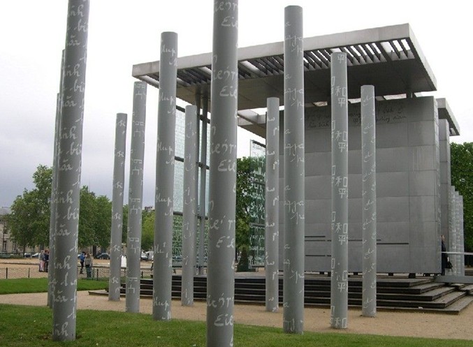 遠處就能夠看到紀念碑那高達70米的碑身高聳入云。四支錐形的白色石柱,組成一座巨大的錐形石塔,插入藍天,象征新加坡的華裔、馬來人、印度裔和歐亞裔所共同擔負的苦難和精神。紀念碑四周環(huán)繞著碧水,方形基座的南北兩面由石階分成四個面,分別由四種文字寫著“日本占領時期死難人民紀念碑 1942-1945”。沿石階而行,穿過水池,來到紀念碑的中心。在四支石柱上,各自有一面銘文,記錄著紀念碑建立的始末。而在整個建筑的中央,有一尊半人高的方形石臺,四面都有不同文字的銘文,中文部分這樣寫道: