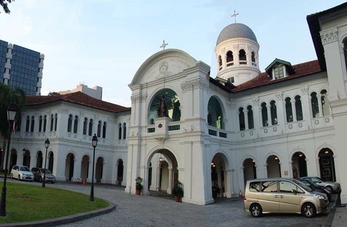 新加坡美術(shù)館坐落在新加坡最早的天主教學(xué)校圣約瑟書院舊址,這組保留完整的古希臘修道院式建筑,在新加坡十分罕見,中央建筑有兩個特征,一是成為勿拉士巴沙路象征的“三公仔”銀色塑像(中間的塑像就是基督教會學(xué)校修士學(xué)院的發(fā)起人圣約翰),二是它的銀色圓形頂樓,圓頂上還有一個十字架。
