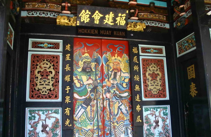 福建會館突出的特點是雕飾極其華麗,可以說是一座雕刻藝術品的展覽館。以種類而言,有木雕、石雕、琉璃雕;就形式而論,有圓雕、浮雕、深浮雕。各種雕刻藝術品引人入勝。大殿重檐間的琉璃雕,色彩鮮艷、精巧細密;山門柱礎上的盤龍狀欲游騰,石獅、石鼓俏麗玲瓏,風韻獨具;迎壁上的盤龍、“米芾拜石”、“蘇武牧羊”等石雕神態(tài)各異,栩栩如生,更是圓雕、深浮雕中的精品。尤其使人嘆為觀止的是,整座山門、大殿可以說是無木不雕,無雕不美。懸于山門梁枋下的花籃和乘蓮珠,造型優(yōu)美,鎦金溢彩。觸目皆是的龍鳳、獅獸,或怒目,或舞爪,千姿百態(tài),各有情趣。梁枋、雀替等處還雕有近百個歷史故事和神話傳說,諸如“八仙過海”、“劉海戲金蟾”、“趙子龍長坂坡救阿斗”等木雕,刀法細膩,惟妙惟肖,為中國寺院建筑中之罕見。