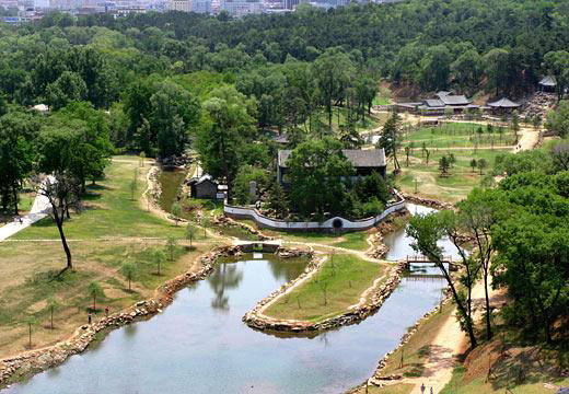 山區(qū)位于山莊西北部,面積443.5萬平方米。山區(qū)占了整個園林面積的4/5。從西北部高峰到東南部湖沼、平原地帶,相對高差180米,形成了群峰環(huán)繞、色壑縱橫的景,山谷中清泉涌流,密林幽深。當(dāng)年利用山峰、山崖、山麓、山澗等地形,修建了多處園林、寺廟。避暑山莊周圍寺廟共占地47.2萬平方米,博仁寺、博善寺、普樂寺、安遠(yuǎn)廟、普寧寺、普佑寺、廣緣寺、須彌福壽之廟、普陀宗乘之廟、廣安寺、羅漢堂、殊像寺等12座金碧輝煌、雄偉壯觀的喇嘛寺廟群,是清政府為安撫中國西北蒙、藏等少數(shù)民族,加強(qiáng)邊疆管理而建造的皇家寺廟。寺廟之集中,規(guī)模之宏大,建筑之精湛,寺廟中大量佛像、祭器制造技藝之高超,使其成為藏傳佛教圣地之一。山區(qū)多處園林解放前多遭破壞,但現(xiàn)在山區(qū)景物仍然十分迷人,其中最引人注目的是遙相對立的兩個山峰上的亭子,一個叫“南山積雪”,一個叫“四面云山”。在亭子上遠(yuǎn)眺,山莊的各風(fēng)景點(diǎn),山莊外的幾座大廟,以及承德市區(qū),周圍山上的奇峰怪石,都可以一覽無余。在另一座山峰上還有一座亭子叫“錘峰落照”,在這里磬錘峰首先映入眼簾,每當(dāng)夕陽西照,磬錘峰被紅霞照得金碧生輝,故名“錘峰落照”。