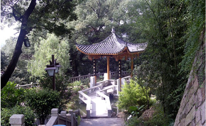 從山的東南麓烏山路拾級登山,行數(shù)十步,就到天香臺。向西折,為沖天臺,是36奇景之一。在后壁鐫刻楷書"古放鶴亭"4字。臺旁還有宋程師孟的篆書石刻"沖天臺"3字。"沖天臺"畔有兩方夾峙的大巖石,巖頂橫著一塊天然條巖,這就是"天臺橋"。此橋奇險,據(jù)說只有"肯舍身"的人,才能登得上去。