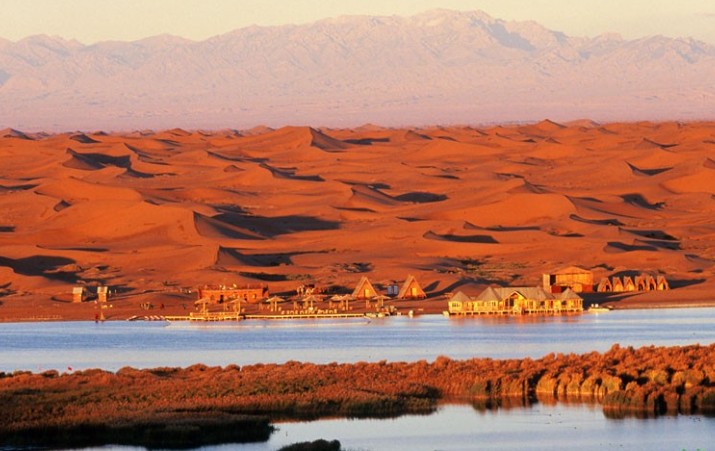 騰格里沙漠是中國第四大沙漠,也是現(xiàn)在流動速度最快、周邊人口密度最大的沙漠,是沙塵暴的主要發(fā)源地之一。月亮湖是騰格里腹地的純天然湖泊,也是一個完全處于原始狀態(tài)的沙漠綠洲。月亮湖有三奇:一奇是形狀酷似中國地圖。站在高處沙丘一看,一幅完整的中國地圖展現(xiàn)在眼前,蘆葦?shù)姆植几菍⒏魇^(qū)一一標(biāo)明。二奇是湖水天然藥浴配方。面積三平方公里的湖水富含鉀鹽、錳鹽、少量硭硝、天然蘇打、天然堿、氧化鐵及其它微量元素,與國際保健機構(gòu)推薦藥浴配方極其相似。湖水極具生物凈化能力,能迅速改善,恢復(fù)自然原生態(tài)本色。三奇是千萬年黑沙灘。在長達一公里、寬近百米的天然浴場沙灘,推開其表層,下面是厚達十多米的純黑沙泥,其質(zhì)地遠超死海的黑泥,更是天然泥療寶物.