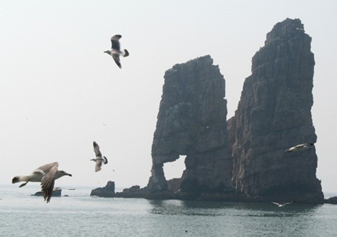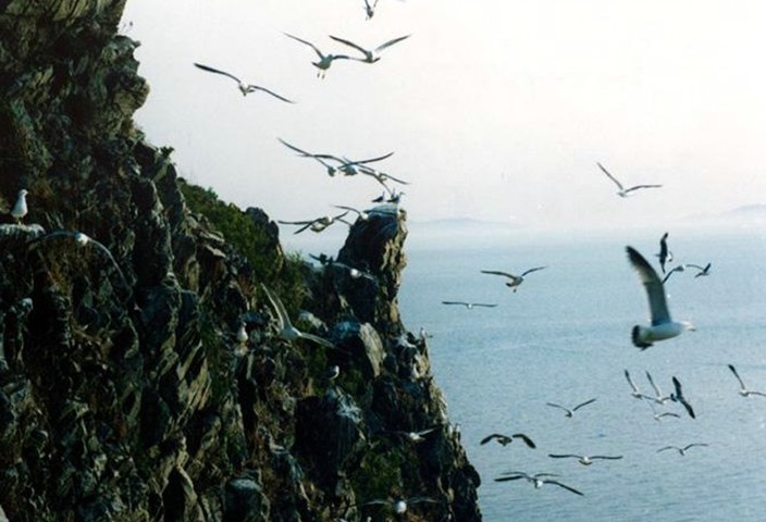萬鳥島坐落于長島諸島中部偏東,這個海拔73.5米、僅有0.05平方公里的小島,在浩渺的汪洋大海之中,簡直是一粒微不足道的沙粒,然而海深魅力大,島小情趣多,因島上棲居著幾萬只黑尾鷗、海鸕鶿、白腰雨燕等海鳥,后稱萬鳥島。海岸地貌懸崖陡壁占90%以上,斷崖系石英巖與板巖互層,節(jié)理發(fā)育,破碎性強(qiáng),經(jīng)千百年風(fēng)化和海蝕,崖壁此凸彼凹,石階、石臺、石窟、石穴鱗次櫛比,形成一座自然的“海鷗石樓”。每年四、五月間,成千上萬只海鷗在此安家,覓食、嬉戲、休憩、生兒育女。這時(shí)的小島變成了喧囂的鳥國、沸騰的劇場、海鷗的天堂。