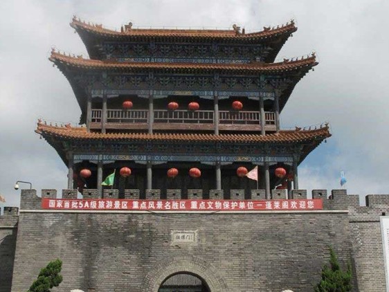 1987年修復(fù),門洞拱頂,寬3米,高5.3米,進(jìn)深13.75米,門洞上方嵌“振揚(yáng)門”匾額,字為吳作人手筆。門樓為兩層閣樓,外觀三層飛檐(俗稱“三滴水”),屋面開山,覆琉璃瓦,脊置六獸,檐角下系風(fēng)鈴,門樓四周為明廊,一層底面與城墻齊高,南北明廊外側(cè)為城堞,二層重檐,明廊柱間有木欄環(huán)繞。振揚(yáng)門兩側(cè)各修復(fù)城墻約50米,門前建有5000平方米廣場。自1989年始,每年的蓬萊經(jīng)貿(mào)懇談會開幕式均在此舉行。1991年世界旅游日登州古市慶典活動亦在此舉行迎賓儀式。