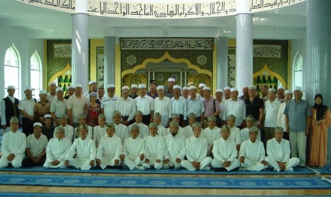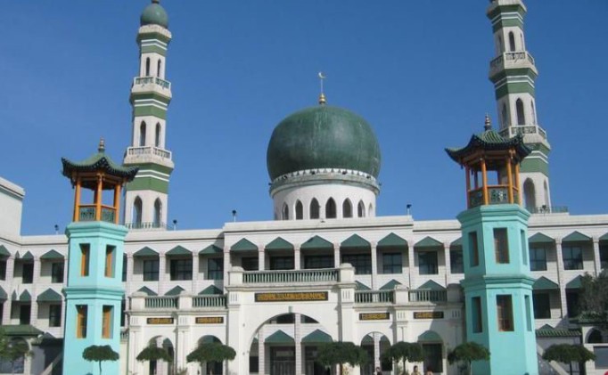 遠(yuǎn)遠(yuǎn)望去,清真寺的塔樓和月牙標(biāo)志十分醒目。四周院墻和古式殿宇高高矗立。這座寺院離路邊不遠(yuǎn),卻高出路面十多米,所以必須沿著一條向北延深的小巷向高處走百十多米,方可到達(dá)山門(mén)口。這里,環(huán)境清靜,境界安謐。進(jìn)入山門(mén)后,便可見(jiàn)院內(nèi)矗立著牌匾。再往里走,就可見(jiàn)到清真寺大殿。