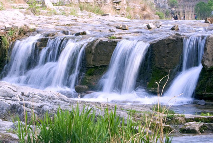 從這里往下游不到一里地,是“土泉瀑布”,它是峨莊瀑布群中最大的一個瀑布。巨大的水流從十幾米高的壩上泄到河岸的亂石上,激起的浪花又形成了許多樣式不同、大小不一的瀑布,最后跌落在山谷里。這些瀑布因自然地勢不同上承下接,形成了層層疊疊的小瀑布,連成一片,大珠小珠落玉盤,非常壯觀。這里是吸引游人最多的地方,為了便于觀賞,在下邊的河谷中建起了三個觀瀑亭,站在觀瀑亭上抬頭望去,還真有點(diǎn)“遙看瀑布掛前川”的味道。