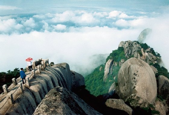 登上天池峰頂,可以領(lǐng)略一下“會(huì)當(dāng)凌絕頂,一覽眾山小”的氣概。這里視野寬闊無(wú)比,景色十分壯麗。是觀日出、云海、佛光、晚霞的最佳方位。天晴之時(shí),極目遠(yuǎn)眺,飛來(lái)峰、銜珠峰,五指峰,山連天際;煉丹湖如同一面銀光閃閃的鏡子被潛河、皖水兩條銀鏈夾在中間;大龍窩、后山、東關(guān)諸峰如同一個(gè)個(gè)土丘,盡收眼底。