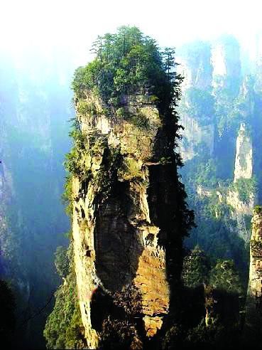 黃石寨南天一柱登黃石寨的途中,約一半的路程處,南天門(mén)上行120米.南天一柱又稱(chēng)指天峰,位于天子山索道上站右側(cè),沿公路下行250米處,一峰依谷而立,沖天而起,柱峰高200余米,下大中細(xì),頂呈鑼槌形。峰頂叢生蒼松,直指藍(lán)天。