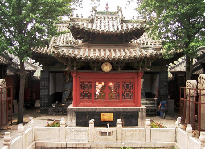 前院中央是靈泉,為孝婦河的主要源頭。呈7.5米見(jiàn)方的正方形,深3米,四周護(hù)有獸雕石欄。泉旁有一石碣題云:“孝婦河名自古今,泉頭一派更弘深。何當(dāng)汲去為霖雨,洗盡人間不孝心”?,F(xiàn)泉已干涸,改為人工泉水循環(huán)池內(nèi)。