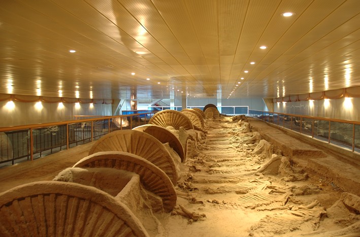 在位于濟(jì)青高速公路路基底部的春秋殉車馬展廳,春秋殉車馬以原地原貌展現(xiàn)在世人面前,這是中國(guó)古車博物館特色的重要展示部位。展廳跨度15米,車馬坑南北排列兩排。一號(hào)坑全長(zhǎng)32米,寬5米,殉車10輛,馬32匹,其中6輛車每車4匹馬駕挽,4輛車每車2匹馬駕挽。原車木已經(jīng)腐朽,在黃土中留下了車的痕跡,車上的銅飾件仍在原部位放置完好。經(jīng)過(guò)考古工作者認(rèn)真細(xì)致的工作,剝剔出車的原形,使每輛車裸露出地面,供人參觀。從車的大小形式分析,車分為兩類,小型車是戰(zhàn)車,大型的為運(yùn)東西的輜重車。馬骨架保存十分完好,特別是馬頭、馬頸上的裝飾品尤為精美,而且形式多樣,各具特色。主要分為三類:一是海貝,呈柿蒂狀排列,由紡織物連續(xù),稱作貝絡(luò);二是小銅珠邊成串飾;三是銅泡和銅珠。二號(hào)坑南端與一號(hào)坑齊,長(zhǎng)8米,寬3米,有車3輛,馬6匹。葬式與一號(hào)坑不同之處在于車馬分葬,車在下、馬在上,所以游人只能看到馬骨。