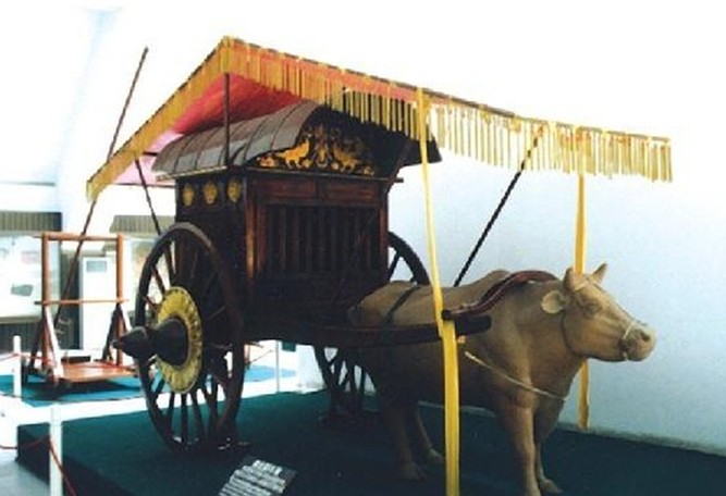 走進(jìn)第二展廳,首先看到的是按照臨淄田齊王陵戰(zhàn)國(guó)墓出土的實(shí)物資料制作的戰(zhàn)國(guó)戰(zhàn)車,具有車轅短、軌距小、輕便靈活的特點(diǎn)。秦車則是依據(jù)秦始皇陵2號(hào)銅車馬仿制的實(shí)用車。漢代車的代表是一輛供高級(jí)貴族所乘的安車和諸葛亮制造的木牛車,特別引人入勝。