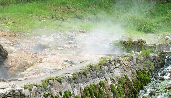 著名的長白溫泉,距瀑布北約一公里處,面積1000多平方米,30多個泉眼終年蒸氣彌漫,散發(fā)著熱氣,水溫高達82℃。因泉水中含有較多的硫氣氫氣體,溫泉底部常有許多氣泡向上翻滾,并發(fā)出開鍋似的響聲,泉水流出后在泉邊形成黃色的硫華。