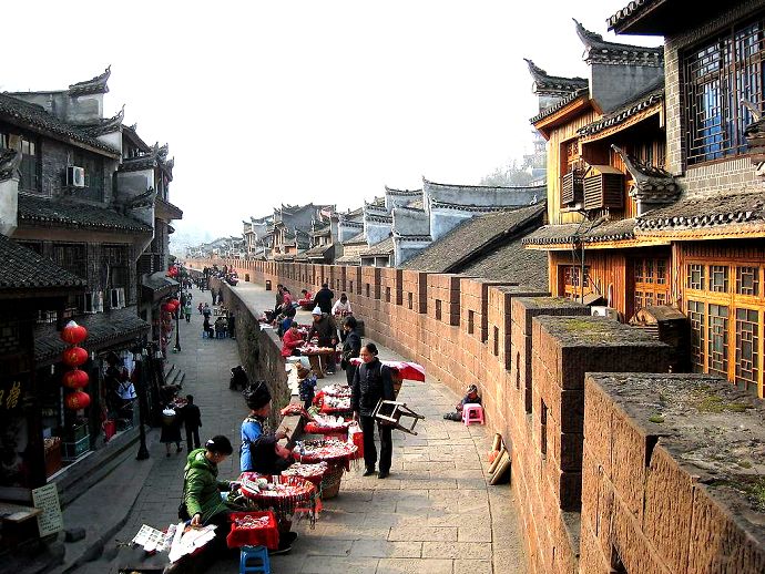 寬不足5米的青石版街,自道門口往西,經(jīng)十字街、東正街、西正街、回龍閣、營(yíng)哨沖、陡山喇、接官亭、沈從文墓地直至天下第一泉,全長(zhǎng)3000多米。是鳳凰最繁華的商業(yè)街。道兩旁的建筑、街巷,都能讓您飽覽古鎮(zhèn)的萬種風(fēng)情。