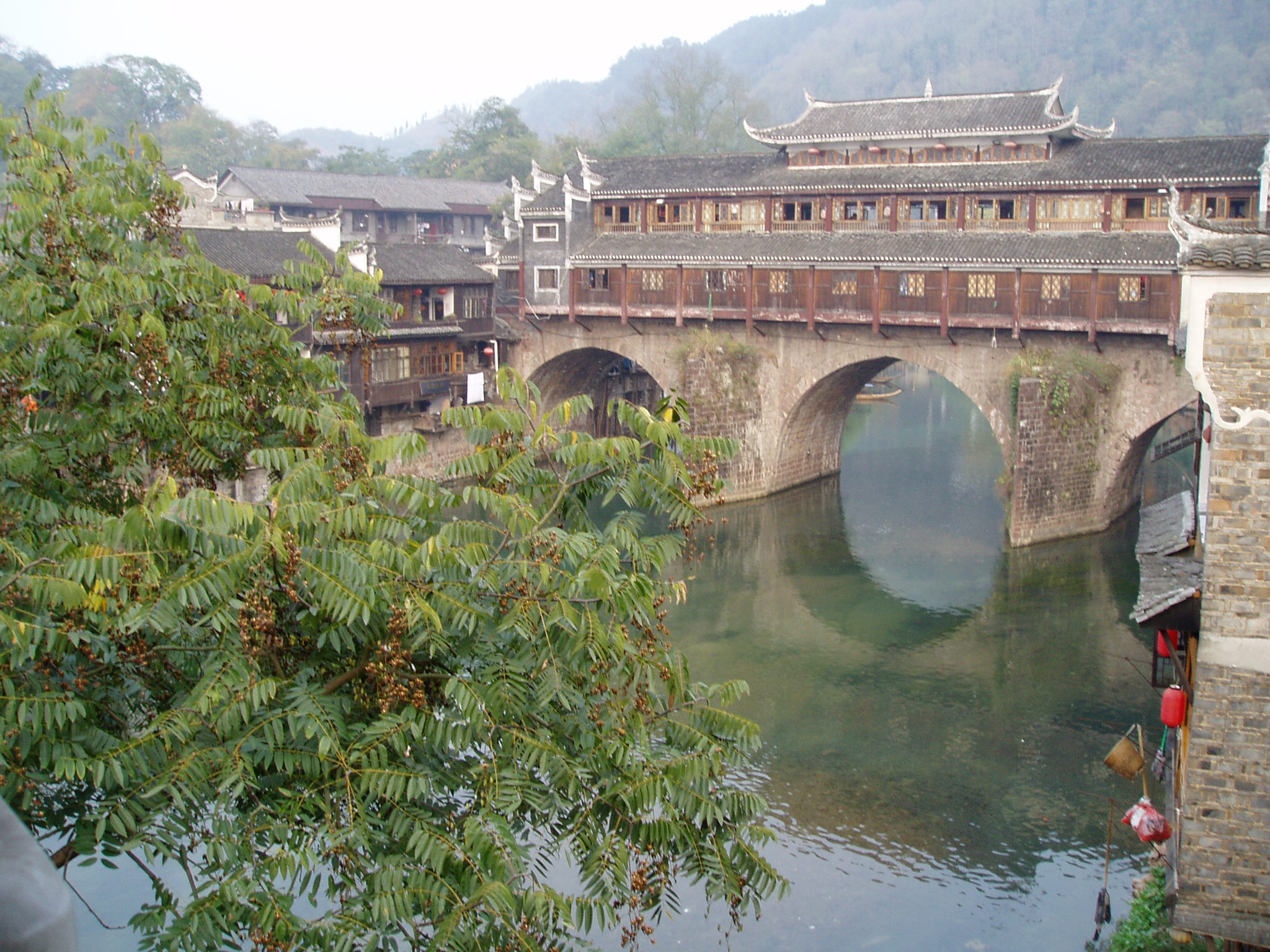 虹橋橫臥于沱江之上,風(fēng)雨樓以它的壯觀和俊美拔然而起,這其實(shí)就是成了一道重疊的風(fēng)景,這道風(fēng)景,由下而上、由古而今穿越著六百多年的歷史。 這座橋始建于明洪武初年,頗信風(fēng)水的鳳凰人都說,這座橋斬?cái)嗟氖且粭l龍頸,令一條巨龍身首異處。怪只怪那位和尚出生的安徽小子朱元璋,聽信一位從昆侖山開始追索一支龍脈,經(jīng)云貴高原來到五寨司城的陰陽先生的讒言,說這兒屏立南郊?xì)鈩?shì)非凡的南華山和與之一脈相承一頭扎入沱江的奇峰,就是他要尋找的龍頭。并由此推斷出總有一天這地方會(huì)有人出來問鼎中原,真命天子將出。那位朱皇帝豈能允許邊遠(yuǎn)的鳳凰有他潛在的對(duì)頭于是朱筆一勾,龍頸被斬,鳳凰風(fēng)水遭毀滅性破壞,鳳凰再也出不來皇帝了。